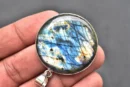 This listing features a natural Blue Labradorite cabochon set in a stamped 925 sterling silver pendant. The gemstone is presented in a round shape, making it suitable for jewelry making or collection purposes. The item is offered by GemstoneHut, a Jaipur-based shop specializing in semi-precious gemstones.