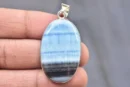 This listing features a natural blue opal cabochon set in a stamped 925 sterling silver pendant. The gemstone is presented in an oval shape, making it suitable for jewelry making or collection purposes. The item is offered by GemstoneHut, a Jaipur-based shop specializing in semi-precious gemstones.