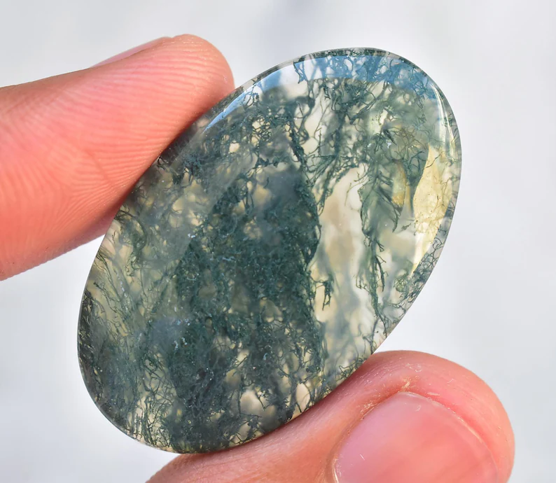 This listing features a high-quality Green Moss Agate cabochon in an oval shape, measuring 37x22x5 mm and weighing 39.20 carats. The gemstone is presented as a loose stone, making it suitable for jewelry making or collection purposes. The item is offered by GemstoneHut, a Jaipur-based shop specializing in semi-precious gemstones.