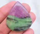 This listing features a high-quality, natural Ruby Zoisite cabochon in a pear shape, measuring 38x32x6 mm and weighing 62.60 carats. The gemstone is polished and presented as a loose stone, making it suitable for jewelry making or collection purposes. The item is offered by GemstoneHut, a Jaipur-based shop specializing in semi-precious gemstones.